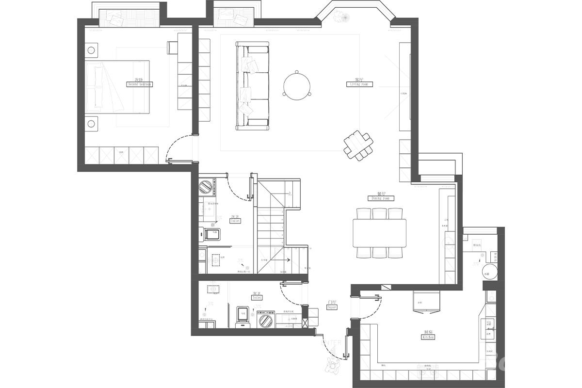 本户型设计以现代简约为风格基调,兼顾空间利用与生活舒适度。 - 公共区域:客厅、餐厅一体化设计,通过家具布局自然分区,增强空间通透感与互动性;客厅采用灵活的软装搭配,满足休闲、会客等多元需求。 - 私密空间:卧室布局方正,预留充足收纳空间,保障居住私密性与舒适性。 - 功能区域:厨房为U型设计,操作动线流畅;卫生间干湿分离,提升使用效率;还规划了独立的家政空间,整合洗衣、储物功能。