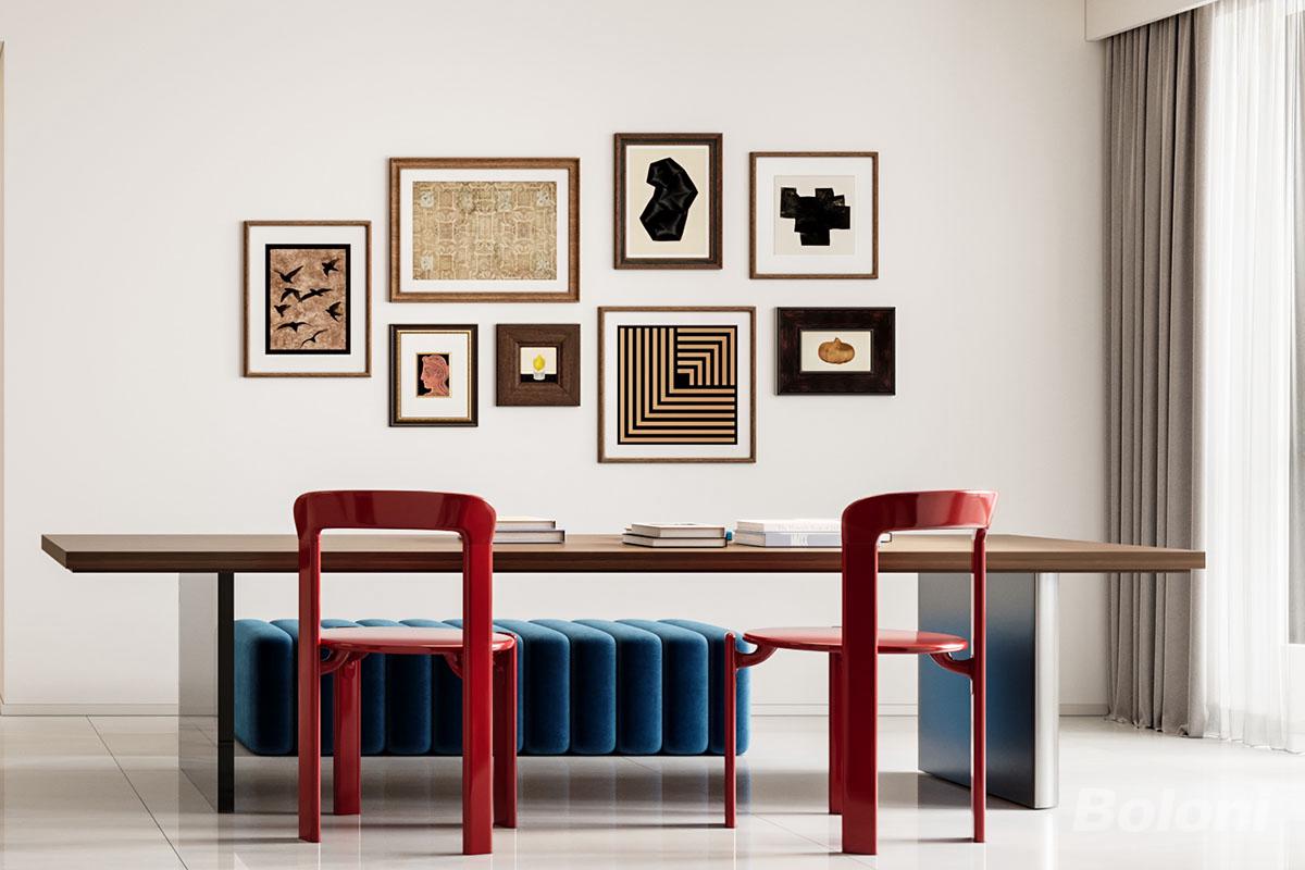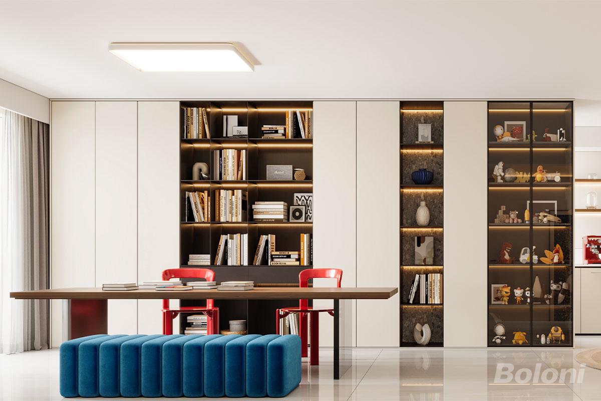 这一空间以现代简约风格打造多功能书房场景,通过简洁线条与通透布局营造舒适办公、阅读氛围。空间主色调以纯净白色墙面搭配深色柜体,嵌入式灯带为陈列区注入温馨氛围感;中央长桌兼顾办公与交流功能,红色座椅提亮视觉,蓝色软包长凳提供灵活坐憩选择。定制化书架系统整合书籍收纳与藏品展示,玻璃柜门与开放格错落分布,让藏品成为空间艺术点缀。整体设计通过色彩碰撞、灯光巧思与功能整合,实现美学与实用性平衡,“Bolon