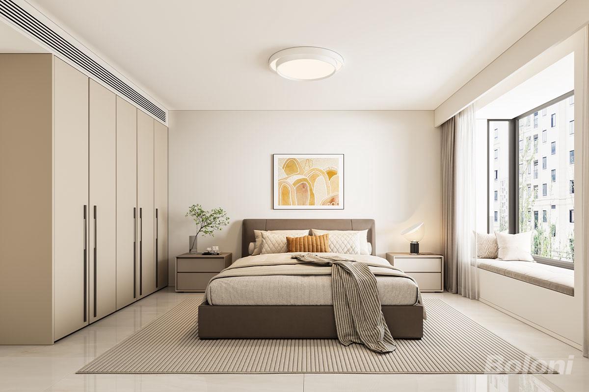 卧室设计说明 本卧室设计采用现代简约风格,以柔和的米白、浅棕为主色调,营造出温馨舒适且整洁有序的休憩空间。 - 空间布局:整体布局规整,左侧定制通顶衣柜满足收纳需求,隐藏式把手设计让柜体外观更简洁;床居中摆放,两侧床头柜提供便捷置物空间,靠窗打造飘窗区域,兼具休闲与收纳功能。 - 细节设计:床头挂画以暖黄、浅棕为主,与床品、柜体色彩呼应,增强空间协调性;床品搭配条纹毛毯,增添层次感;绿植与简约