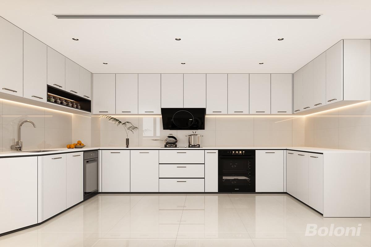 厨房设计说明 本厨房设计采用现代简约风格,以白色为主色调,搭配黑色细节,营造出简洁明亮且富有质感的空间氛围。 - 布局与收纳:采用U型布局,上下柜体充足,满足多样收纳需求。上方柜体隐藏式把手设计,使外观更整洁;下方抽屉与柜门结合,便于分类存放物品。 - 功能与美学:中岛区域集成烹饪功能,黑色电器(烟机、烤箱)与白色柜体形成对比,提升视觉层次。灯光设计巧妙,柜底灯带增强氛围感,筒灯提供充足照明。