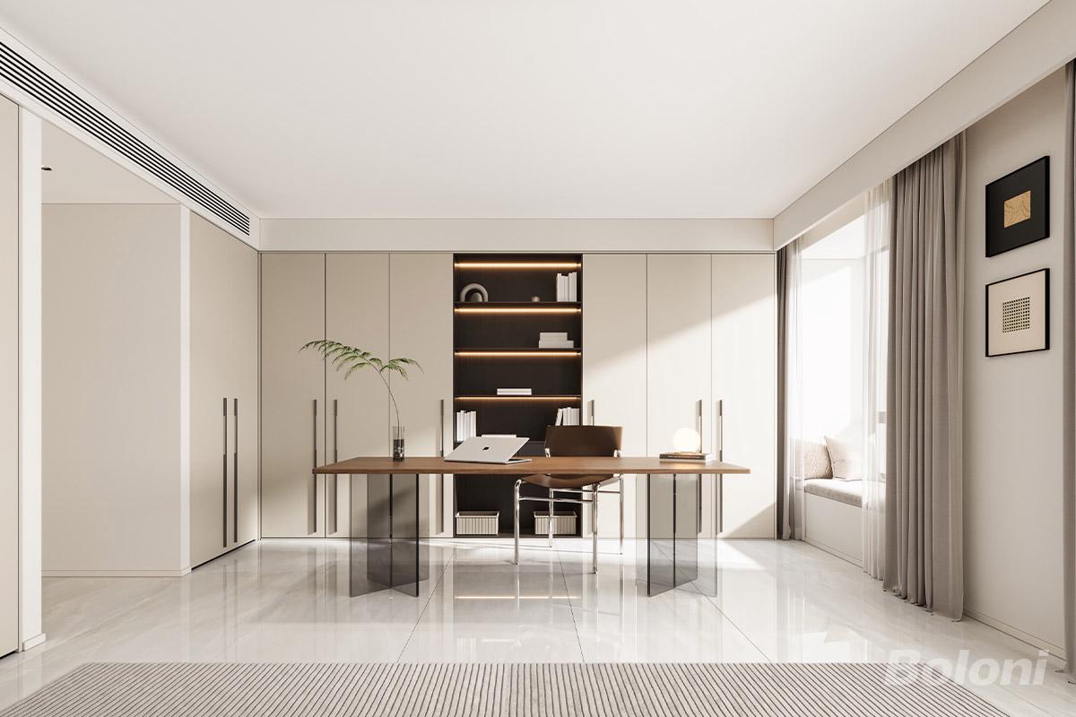这是一间现代简约风格的书房设计,以“极简美学+实用功能”为核心。空间采用低饱和色调,白色墙面、地面搭配浅棕书桌,营造出干净柔和的视觉氛围。布局上,中央的木质书桌搭配简约座椅,满足办公学习需求;后方定制通顶柜体,部分开放式格架以暖光烘托,兼具收纳与展示功能。绿植与简洁摆件的点缀,增添生机与精致感;右侧的休闲区与书房相连,提升空间复合性。灯光上,自然光结合室内柔和照明,材质运用哑光瓷砖、金属拉手提升质