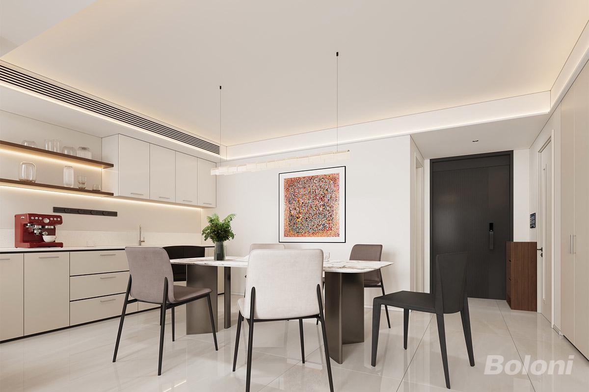 空间布局:采用开放式一体化设计,餐厨区域自然衔接,以浅灰色哑光地砖通铺增强整体延伸感。中岛台与餐桌呈“L”型布局,既满足备餐功能,又可作为临时用餐或社交吧台,提升空间利用率。 色彩搭配:主色调以白色、浅灰、原木色为主,白色烤漆橱柜搭配浅灰色石英石台面,局部运用原木色餐椅与绿植点缀,平衡冷调空间的温度,营造干净通透的视觉效果。 材质与细节:墙面选用环保乳胶漆,局部嵌