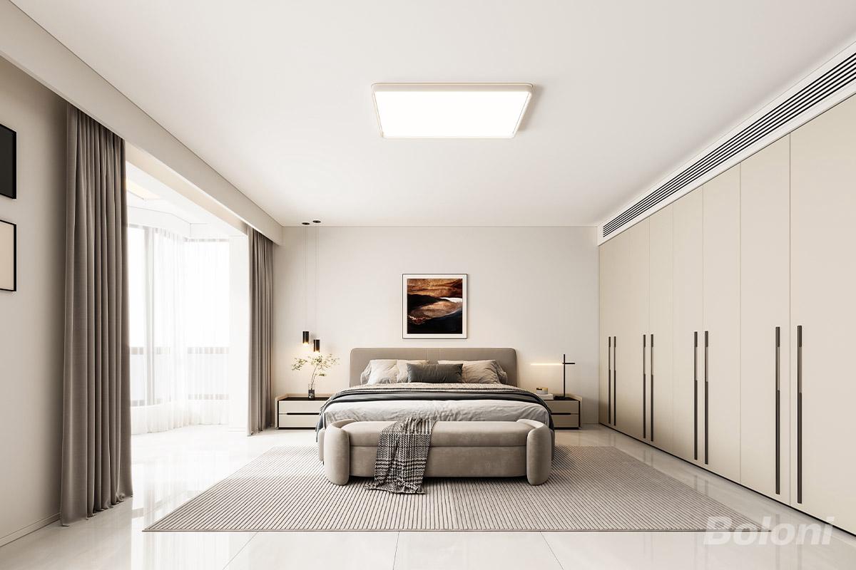 这是一间现代简约风格的卧室设计,以“极简线条+柔和质感”为核心。空间采用低饱和色调,白色墙面/地面搭配浅棕家具,营造干净柔和的视觉氛围。布局上,中央大床为核心,浅棕软包床头搭配黑白床品,床尾凳+格纹毯增添温馨感。左侧落地窗+深棕窗帘保障采光与隐私,床头柜上的花艺、灯具提升精致感;右侧定制通顶衣柜,极简拉手设计与空间风格统一。灯光上,嵌入式顶灯+床头壁灯保障柔和照明,材质运用哑光瓷砖、绒面家具提升触