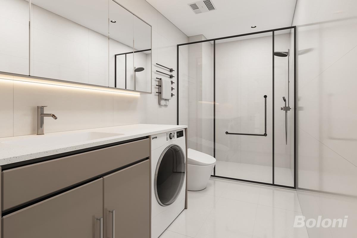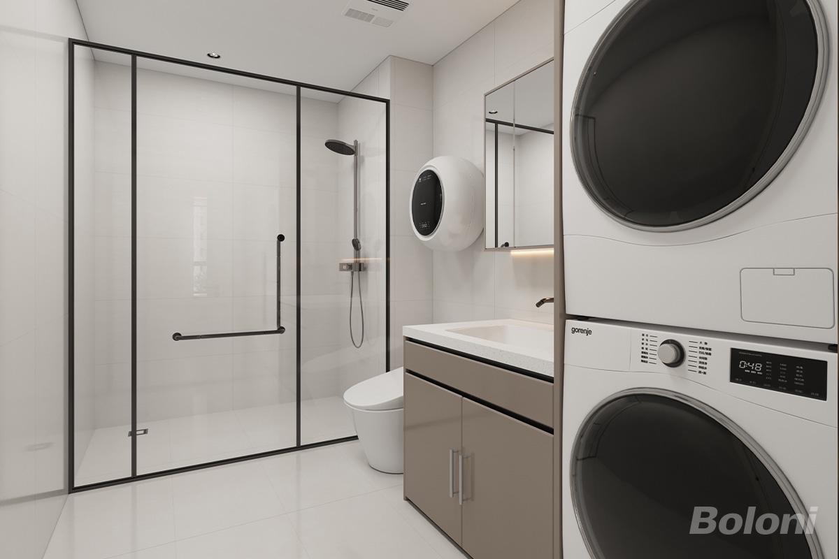 这是一套现代简约风格的卫浴空间设计,以“高效利用+质感美学”为核心。整体采用低饱和色调,白色墙面/地面搭配浅棕柜体,营造干净柔和的视觉氛围。左侧洗漱区,定制镜柜整合收纳与梳妆功能,嵌入式灯带增强照明;下方浅棕抽屉柜+石英石台面,搭配极简水龙头,实用且显精致。中部嵌入滚筒洗衣机,实现卫浴与洗衣功能复合。右侧淋浴区以黑色窄边玻璃隔断界定,搭配同色系扶手、花洒,通透又具设计感;智能马桶提升使用体验。