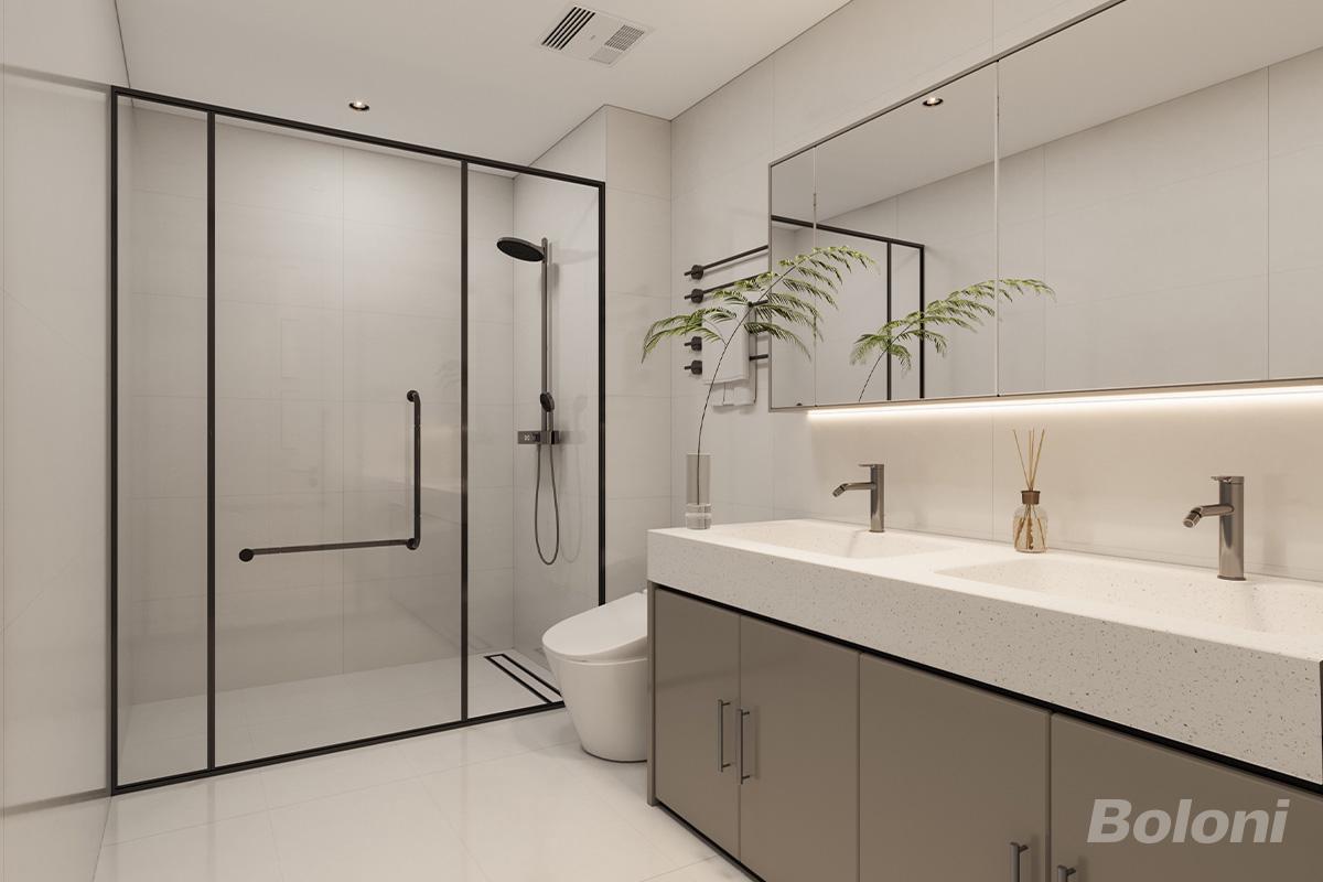 该卫浴设计为现代简约风格,以“极简线条+实用美学”为核心。空间采用低饱和色调,白色墙面/地面搭配浅棕柜体、黑色金属线条,营造干净柔和的视觉氛围。左侧淋浴区,黑色窄边玻璃隔断通透利落,搭配同色系扶手、花洒,界定功能区的同时不压缩空间感;智能马桶提升使用体验。右侧洗漱区,定制镜柜整合收纳与照明,下方浅棕抽屉柜+石英石台面,搭配极简水龙头,兼顾收纳与操作;瓶插绿植、香薰增添生活气息。