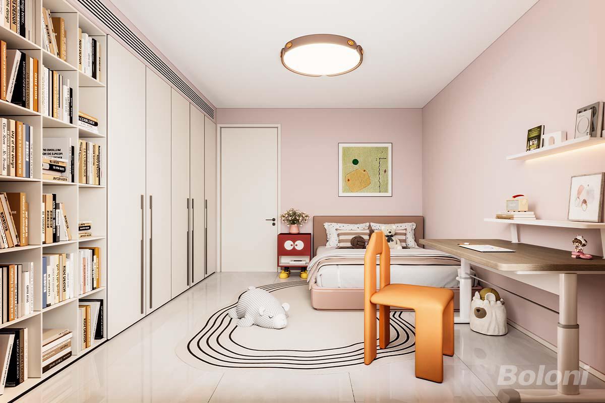本儿童房设计围绕童趣与实用展开,以柔和浅粉色为主色调,营造温馨治愈的成长空间。 - 收纳系统:左侧定制通高书架与衣柜,满足书籍、衣物收纳需求,保持空间整洁;右侧书桌搭配悬浮层板,既提供学习区域,又可以展示藏品。- 睡眠区域:床品简约柔和,搭配趣味床头柜,增添了空间活力;墙面挂画与地面曲线地毯呼应,强化了童趣氛围。- 细节设计:圆润造型的座椅、可爱的地面玩偶,兼顾安全与趣味性。