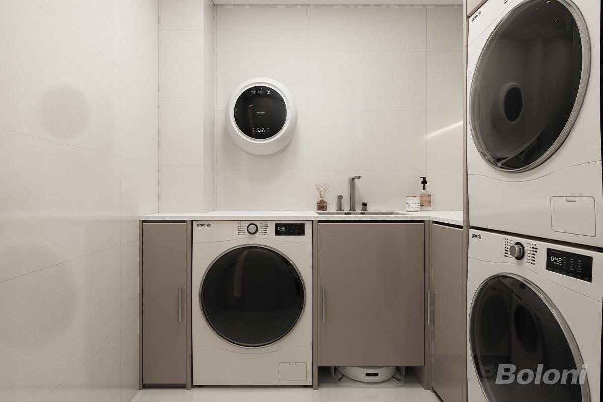 本洗衣房设计遵循现代简约+实用主义理念,以米白、浅棕为主色调,打造整洁高效的洗护空间。 - 布局规划:采用“洗-护-存”一体化设计,左侧嵌入洗衣机,搭配同色系收纳柜,满足洗衣用品与清洁工具收纳;中间水槽方便手洗、预处理污渍;右侧叠放式洗烘套装节省空间,提升洗护效率。 - 细节巧思:墙面浅灰瓷砖易清洁,圆形挂钟增添设计感;台面香薰、洗手液等小物提升生活质感,底部预留扫地机器人空间。