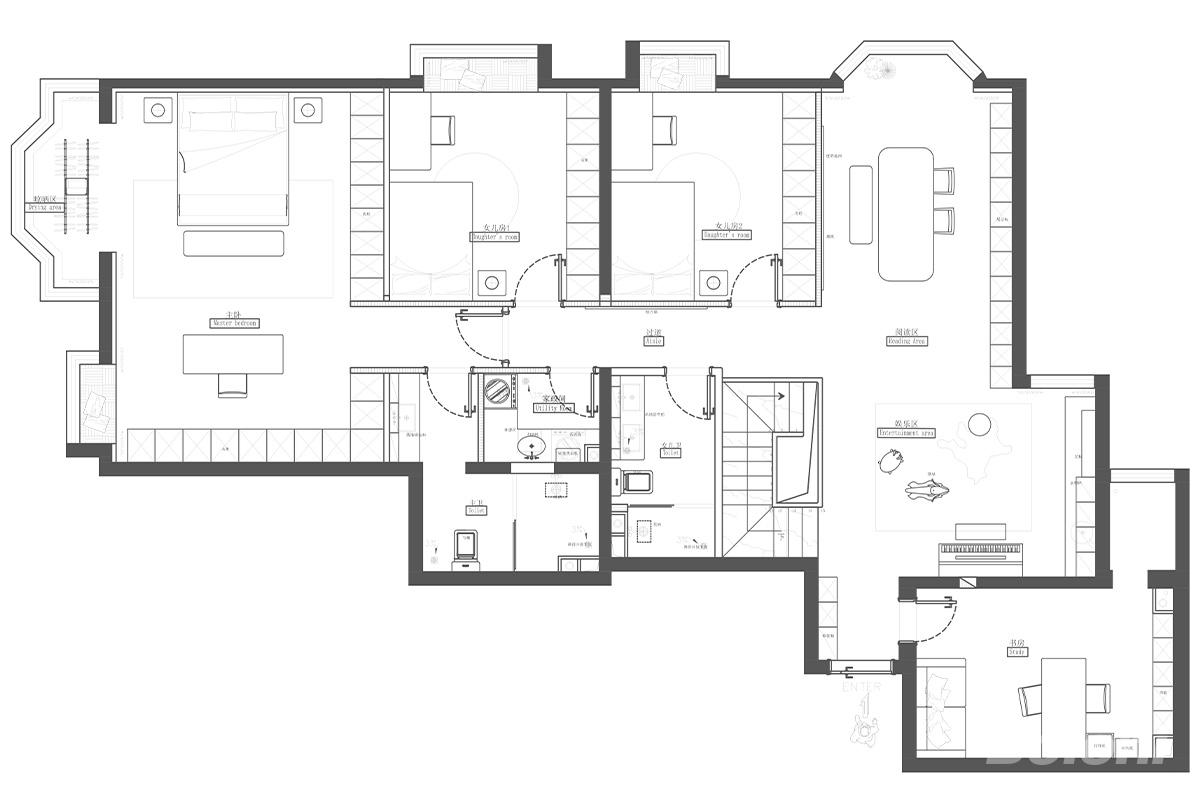 现代宜居风户型设计 本户型设计围绕“通透布局、功能集成、质感生活”理念,适配当代家庭居住需求。 - 空间规划:采用“开放公区+私密静区”分区逻辑,入户后客餐厅形成社交核心,与含钢琴的休闲区连贯互通,设计通过合理动线、人性化功能与雅致细节,构建“舒适、高效、有温度”的现代居住场景,精准回应家庭全周期生活需求全屋以浅木色+暖灰为主色调,搭配金属收边、艺术吊灯提升精致度让实用与美学渗透每处空间。