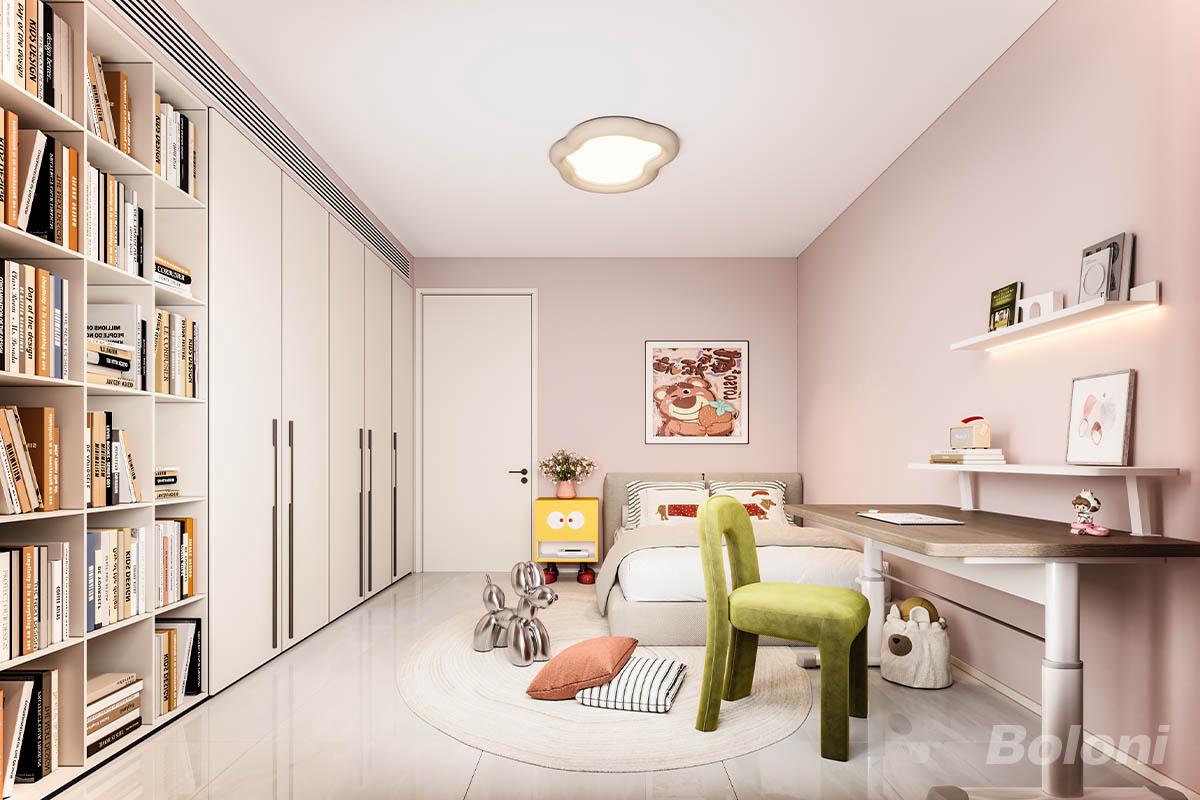 该女儿房以柔和治愈的甜美风为核心设计逻辑,通过低饱和度粉色墙面奠定温馨基底,搭配纯净白色柜体,平衡少女感与空间通透度。功能布局上实现“收纳+睡眠+学习”的高效整合:左侧通顶书架与衣柜一体化定制,既满足书籍展示与衣物收纳需求,又强化空间纵深感;中央睡眠区以简约床具为核心,床头卡通装饰画、趣味“大眼睛”床头柜与地面银色小狗摆件,为空间注入童真活力;右侧学习区设分层书桌,层板陈列装饰画与小物件,兼顾书写