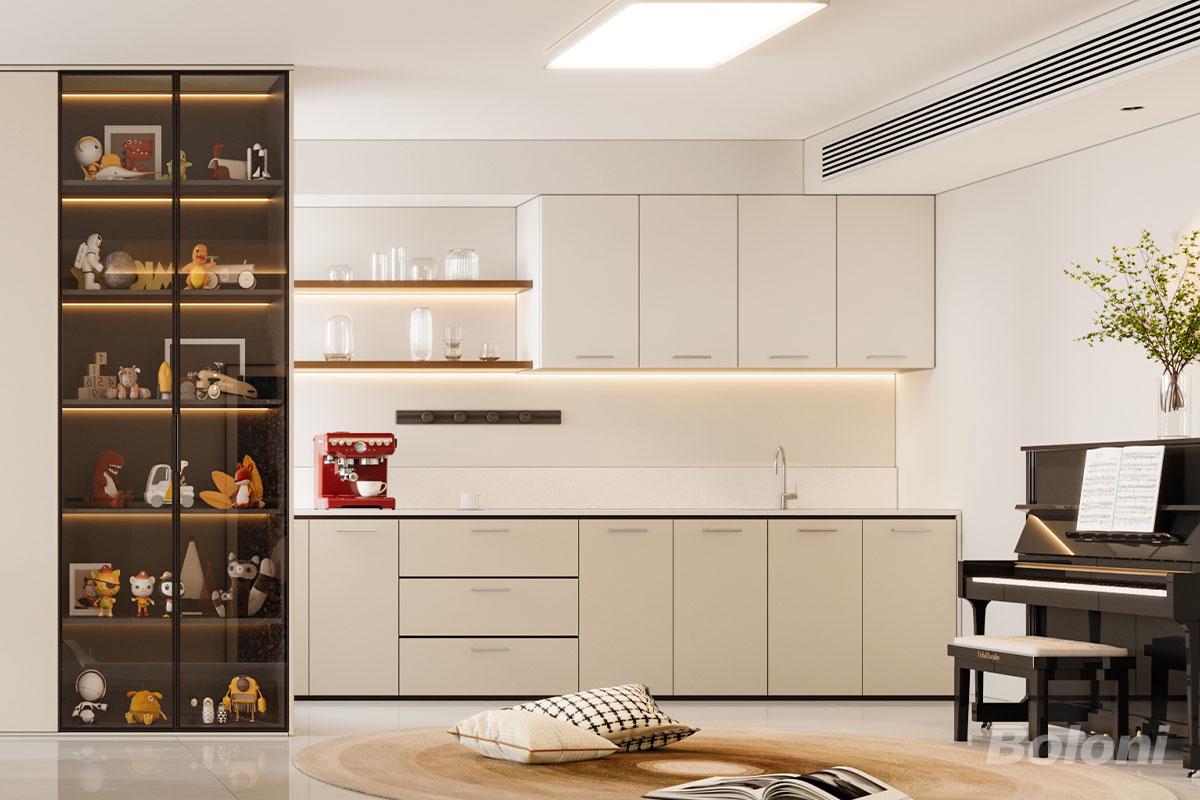 这份空间设计以现代简约风格为基底,融合“展示+烹饪+休闲”复合功能,打造兼具美学与实用性的生活场景。左侧定制玻璃展示柜内置暖光灯带,通透柜体将潮玩、藏品有序陈列,成为个性化视觉焦点;中部烹饪区采用无把手浅灰橱柜,搭配开放木色层架,红色咖啡机点亮空间活力,操作台面简洁易洁;右侧钢琴区以绿植、乐谱营造艺术氛围,地面圆形地毯与抱枕软化空间,实现动静区域自然过渡。灯光上,嵌入式顶灯与展示柜氛围灯层次呼应,