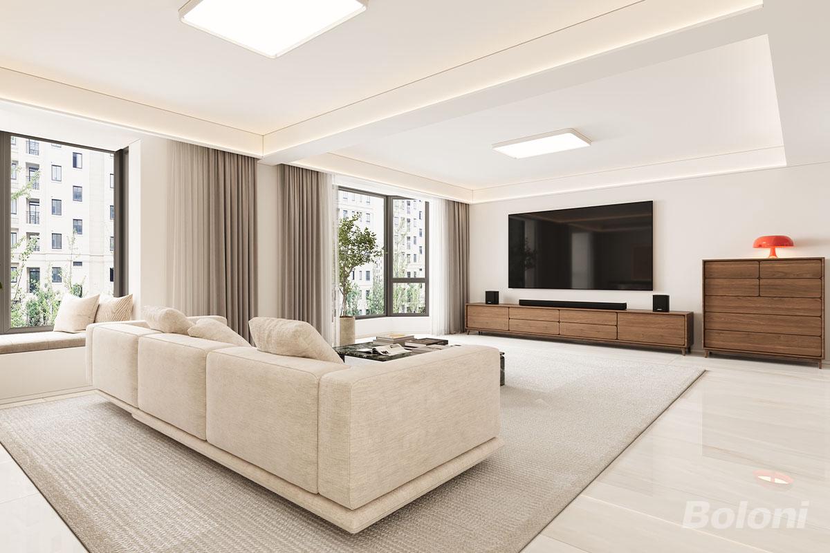 客厅设计说明 本客厅设计采用现代简约风格,以米白、浅棕为主色调,搭配原木色家具,营造出简洁舒适、自然温馨的空间氛围。 - 空间布局:开放式布局增强通透感,米白色沙发搭配同色系飘窗卡座,形成休闲互动区;中央黑色茶几简约实用,电视墙区域以原木色柜体收纳,搭配悬浮式设计的电视,整体利落大气。 - 细节设计:浅咖色渐变窗帘柔化光线,窗边绿植增添生机;地面米白地毯与大理石瓷砖结合,提升空间质感;红色台灯