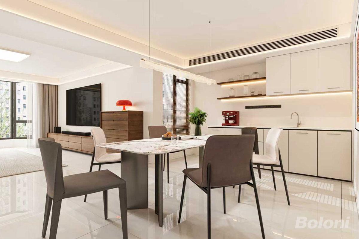 本家居设计采用现代简约风格,以简洁的线条与柔和的色调打造舒适空间。 - 空间布局:客餐厅一体化设计,增强空间通透感,通过家具自然分区,兼顾互动与独立使用需求。 - 材质运用:地面选用亮面瓷砖,提升空间明亮度;柜体采用木质与白色烤漆结合,兼具了质感与时尚感。 - 功能设计:厨房开放式布局,搭配简洁橱柜与置物架,操作便捷且美观;客厅电视墙简约大气,搭配收纳柜满足储物需求。