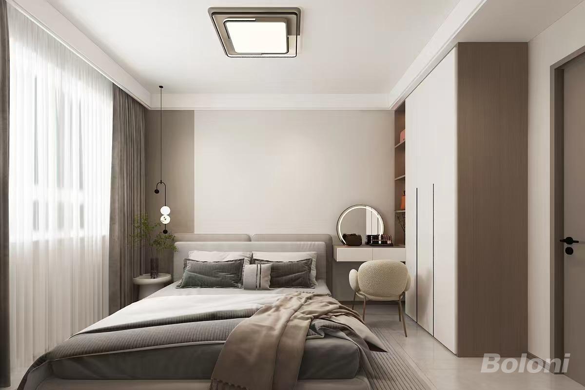 本现代轻奢卧室以浅灰、米棕构建静谧基底,悬浮灯与线性光勾勒层次。一体化柜体整合收纳,布艺软饰柔化硬朗。借材质温差(木的温润、金属的隐奢)与光影错落,在极简秩序里,孵育松弛的私享氛围 。