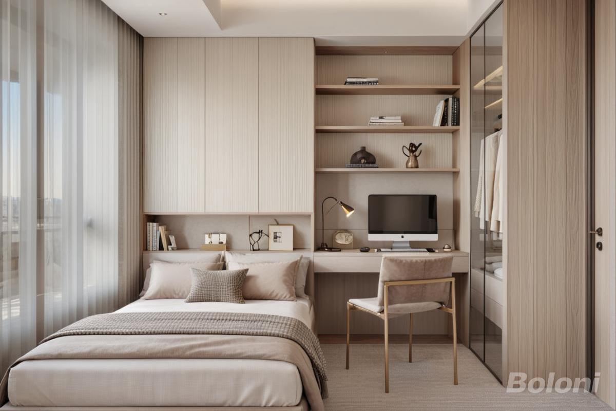 本现代轻奢次卧,以浅木肌理铺陈温润基底,一体化柜体整合睡眠、收纳与办公功能。金属椅脚点睛精致,纱帘柔化光线。借材质呼应与功能叠合,在紧凑尺度中,营造简雅有序、舒适兼具格调的私享场域 。