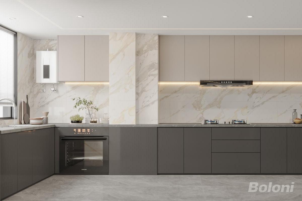 本现代轻奢厨房,以浅米大理石纹墙筑优雅基底,深灰哑光橱柜立沉稳秩序。线性灯带勾勒悬浮层次,金属烟机点睛精致。一体化布局串联流畅动线,借材质温差与光影变幻,诠释实用与格调兼具的烹饪美学 。