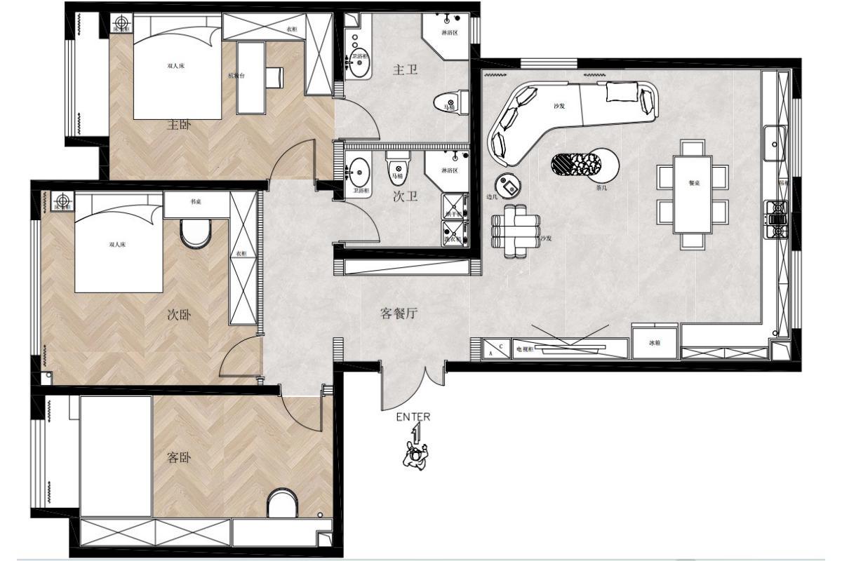 本方案以现代轻奢为骨,客餐厅一体化串联公区通透感,卧室区鱼骨拼木调围合私密。石材冷峻、金属精奢与布艺柔软交织,线性光勾勒层次,借空间开合与材质温差,筑就秩序里的优雅松弛 。