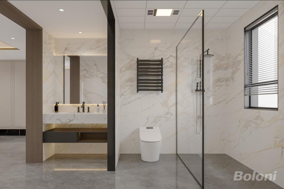 本现代轻奢卫浴设计,以米白大理石构建优雅基底,浅灰地砖延伸通透感。黑框玻璃利落区隔干湿,哑光金属件点睛。台下收纳与线性灯带暗藏巧思,借材质肌理与光影层次,营造秩序与精致兼具的舒适场域 。