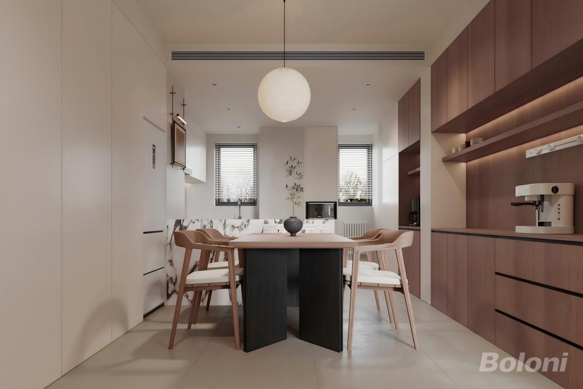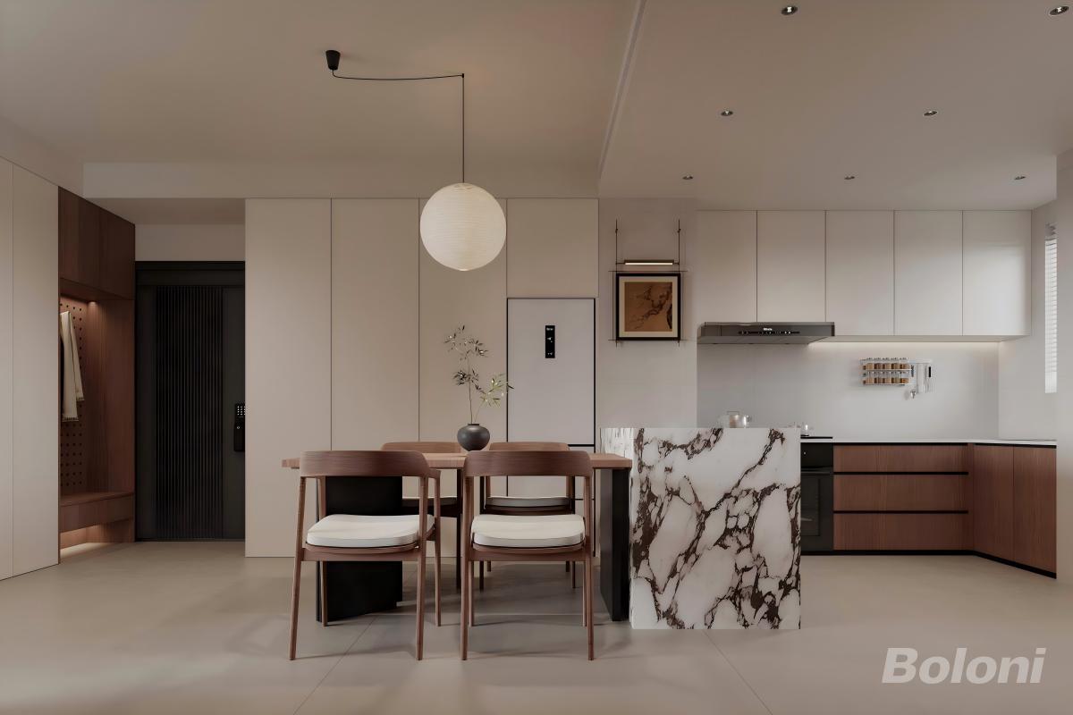 以浅木色(柜体、家具)+奶白为基底,搭配大理石纹(岛台)+黑色金属(桌腿),柔和的木质质感带出温馨感,石材与金属的点缀又提升了轻奢精致度。