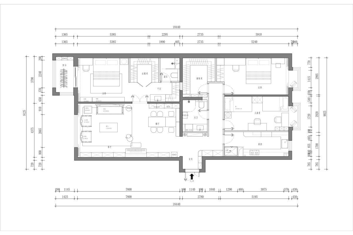 减少公共区与私密区的交叉动线,比如从玄关到客厅、餐厅的路径更顺畅,卧室区相对独立安静:利用自带的衣帽间做“L型衣柜+梳妆台”,床侧配悬浮床头柜,主卫做干湿分离(淋浴+马桶+洗手台),提升睡眠区的静谧与便利:根据需求设为儿童房(搭配高低床+学习桌)或客房(简约床+衣柜),灵活适配家庭阶段。