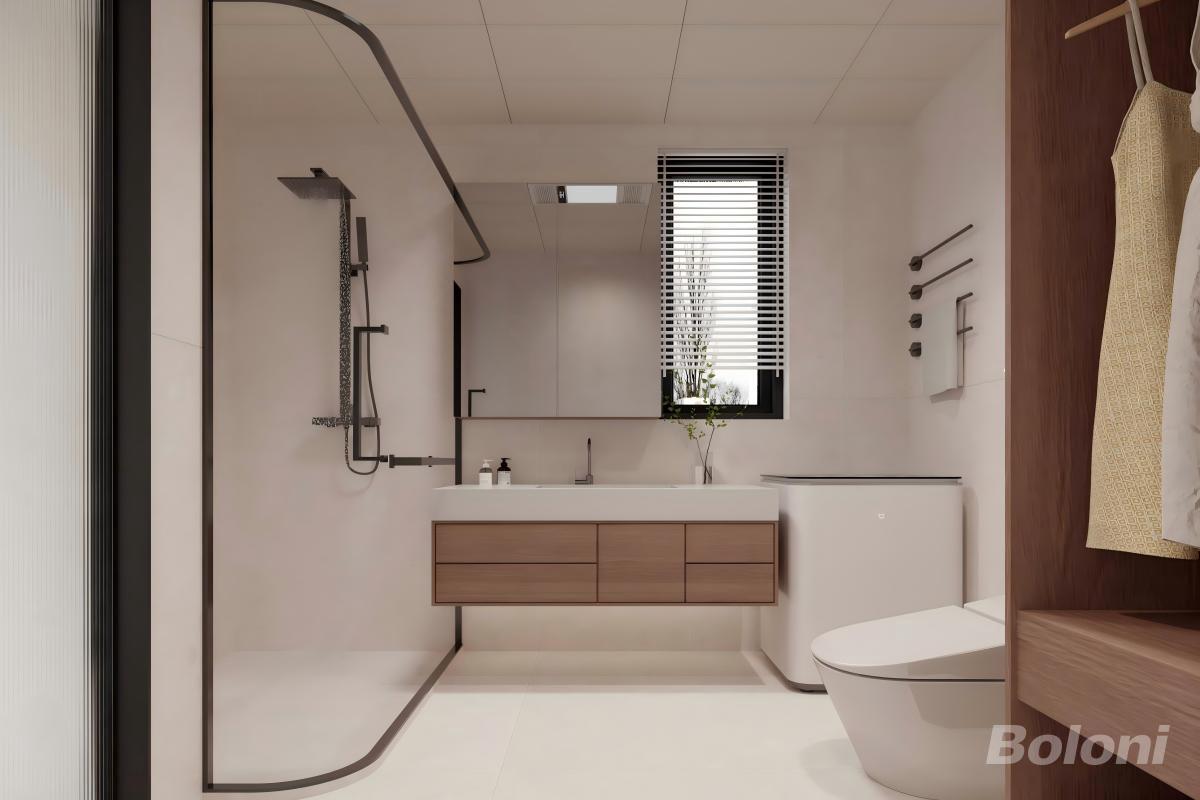 主色调是浅米白(墙地)+浅木色(柜面),低饱和配色显通透;线条利落:悬空柜、壁挂马桶、嵌入式镜柜都是“去冗余”的简约设计,同时提升了空间整洁度和清洁便利性。