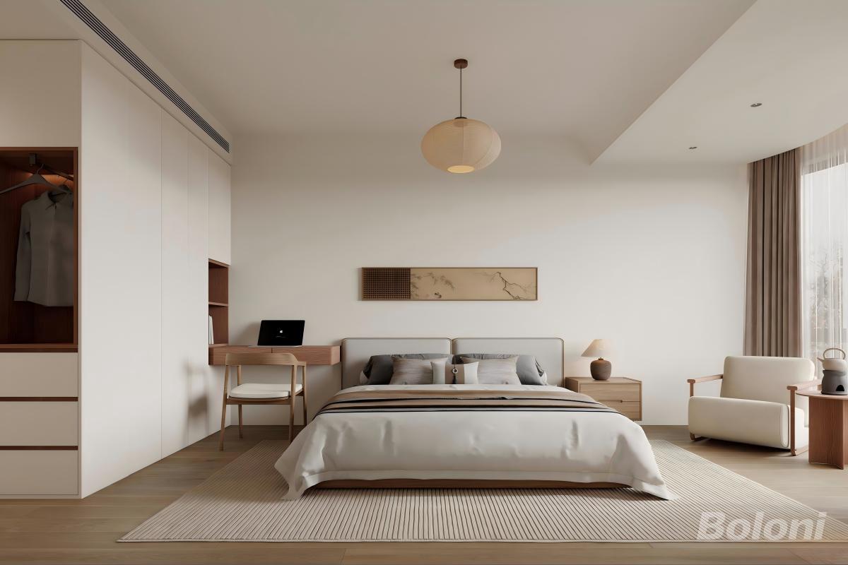 以奶白、浅木色为基底,搭配低饱和灰棕(床品)+水墨装饰画,柔和的木质质感带出温馨感,新中式元素(格栅挂画)则注入了雅致韵味。