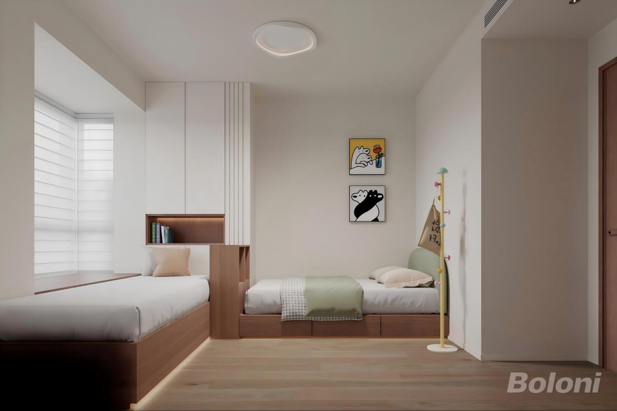 用了浅原木色(地板、柜体)+白色(墙面、柜门)的低饱和配色,干净柔和,是日式“自然舒适”的质感;线条简洁利落,比如顶天立地柜、嵌入式床体,都是现代简约的“去冗余”设计,同时结合了榻榻米式的储物床,空间利用率拉满。