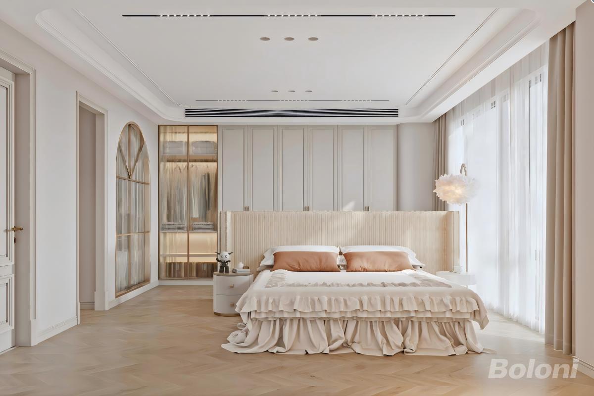 以奶白、浅木色为主调,搭配褶皱床品、编织床头这类柔性质感单品,整体氛围像“被奶油包裹的温柔”;金色线条(拱门、衣柜框)做点缀,轻法式的精致感立刻就出来了。