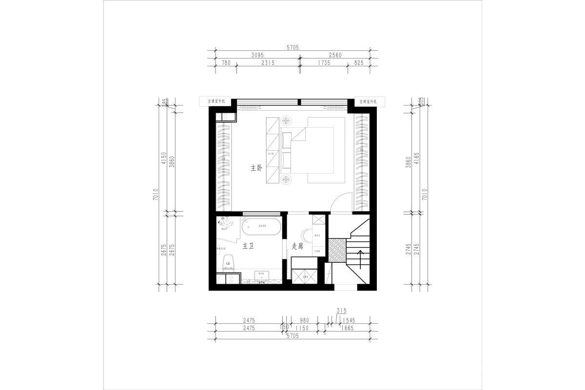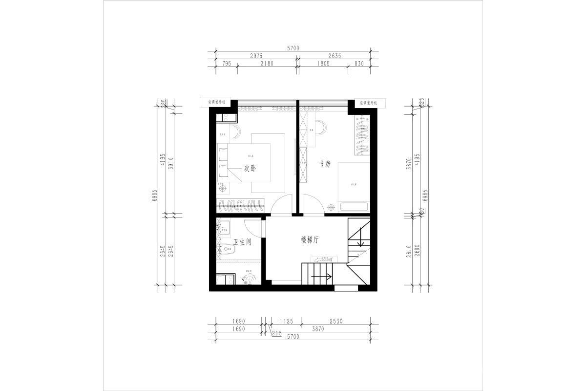 规划 “次卧” 空间,满足独立睡眠需求,配备充足储物(如衣柜),解决衣物收纳痛点。包含 “卫生间”(满足上层如厕、洗漱需求)和 “楼梯厅”(连接下层空间,实现垂直交通),保障功能完整性。