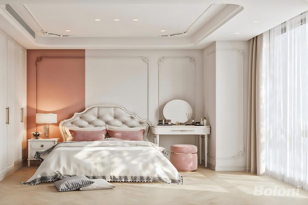 以奶白为基底,搭配柔粉色(墙面、软装)+皮革(床头)+雕花线条,柔和色调里透出法式的浪漫精致;金属把手、雕花装饰则提升了轻奢质感。