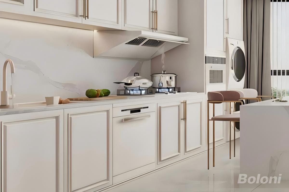 以奶白色为主调,搭配浅灰大理石纹(墙面)+金色金属把手,柔和底色里透出精致的轻奢质感;柜门的线条装饰是轻法式的标志性元素,弱化了厨房的冰冷感。