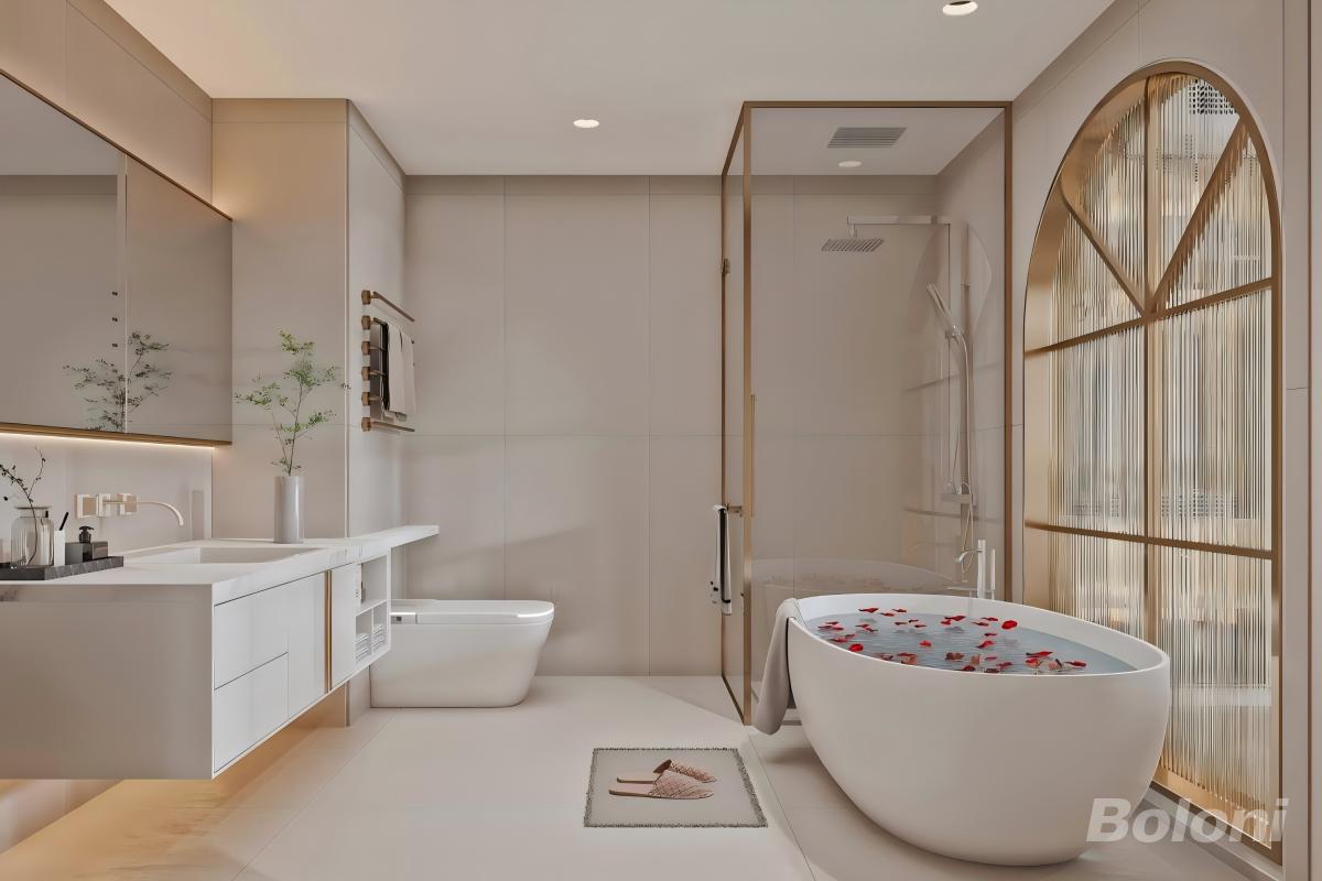 以奶白、浅米色为主调,搭配金色金属线条(拱门、五金件)+哑光板材,柔和底色里透出优雅的轻奢质感;独立浴缸、通透隔断则让空间更显松弛舒适。