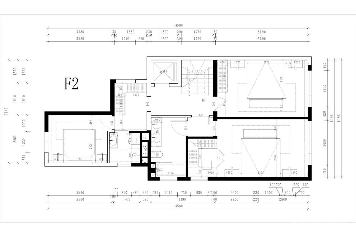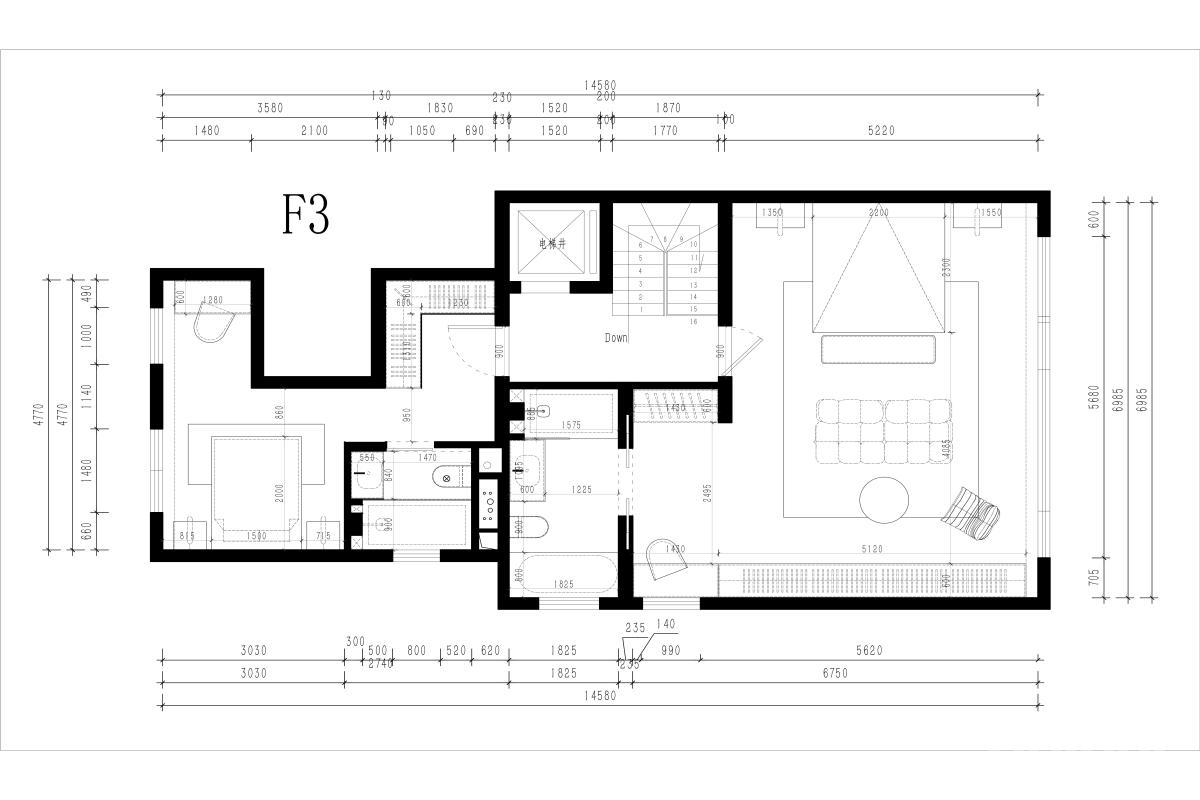 规划多间卧室(至少三间),满足家庭多成员的独立睡眠空间需求;主卧空间宽敞,配备独立卫浴(双台盆、浴缸等配置),打造 “套房级” 居住体验。设置集中式卫浴空间(含马桶、洗手台、浴缸等),同时主卧带独立卫浴,实现 “公共卫浴 + 私密卫浴” 的双系统,提升多人居住的使用效率。部分区域可作为卧室配套的 “迷你起居空间”(如小书桌、休闲角落),满足上层的阅读、办公等轻量需求,强化空间的功能性.