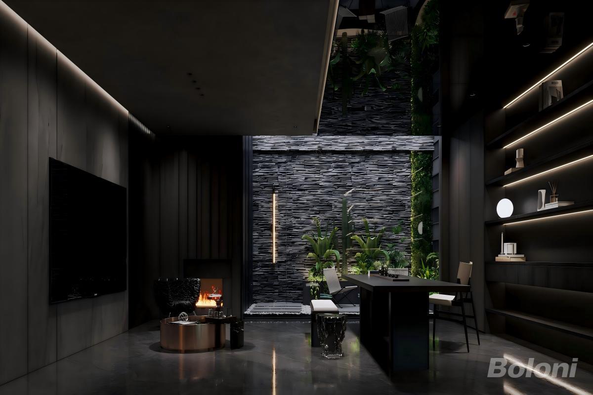 暗黑系是酷炫、个性、真实的代表,在设计上我们并未作浓烈的色彩分割,而是凭借低饱和度的灰调赋予空间神秘感。同时利用深色木饰面、布艺沙发、深灰大理石等各种材质互为衬托,互为补充,相互交织于空间里,呈现出严谨的秩序与和谐,共同构筑品质生活的节奏和韵律。