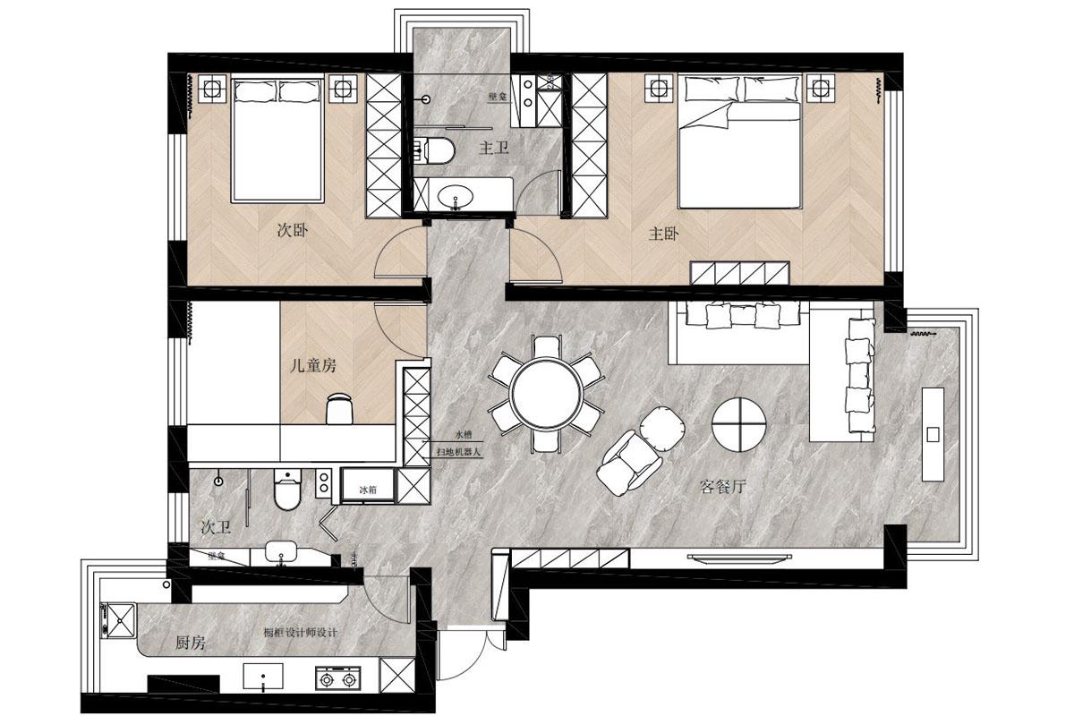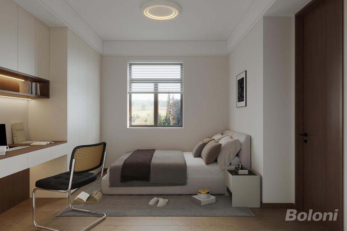 本空间以中古格调勾勒多功能场域,米棕基底糅合藤编椅、百叶窗的复古肌理。一体化书桌嵌暖光,床具线条简雅,在收纳与休憩间达成平衡。借材质呼应与光影晕染,将岁月沉淀的温润,藏进实用又松弛的日常里 。