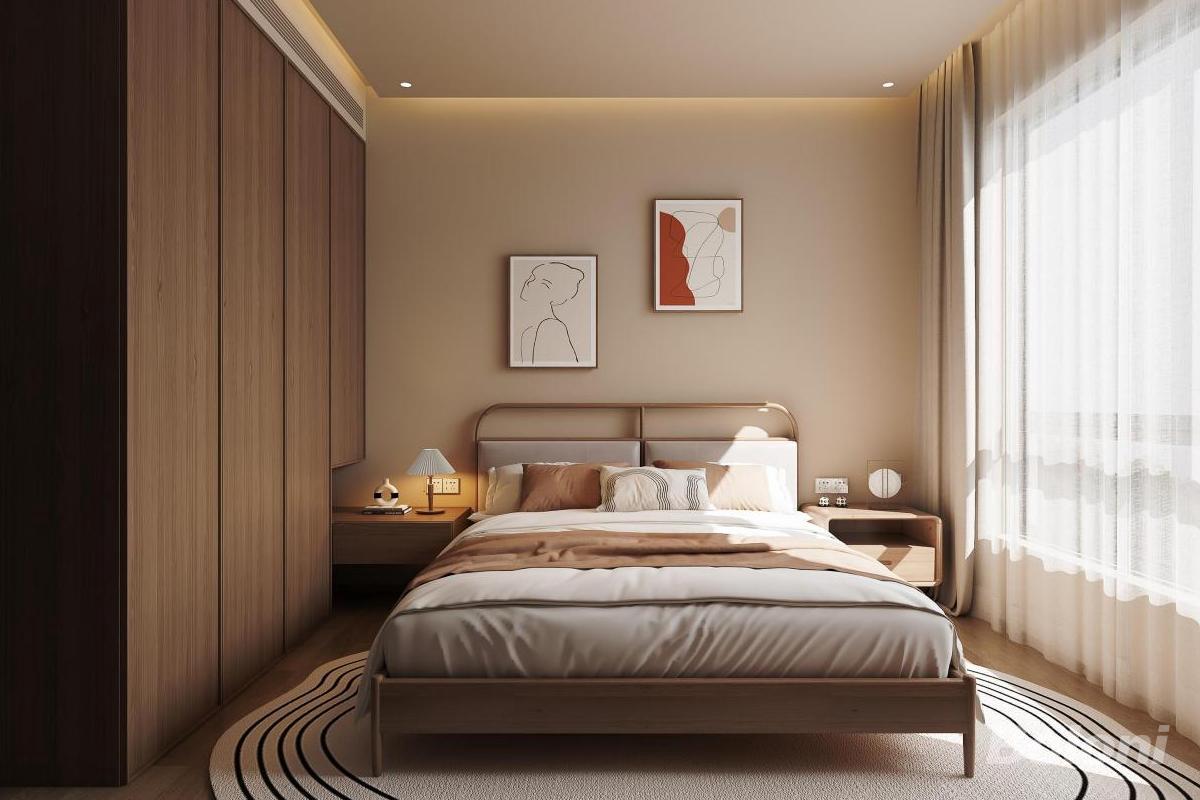 本卧室以中古风格为魂,温润木作构建基底。低饱和色调晕染静谧,床具线条简约含复古弧度,纱帘滤入柔光,搭配抽象挂画。在秩序与随性间,糅合岁月沉淀的温润,打造兼具复古质感与现代舒适的休憩场域 。