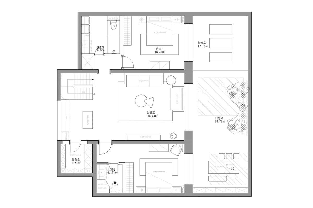 该层空间规划完善,包含影音室、健身房、阳光房、客房及卫生间等区域,动线流畅,功能多样,满足娱乐、健身与居住需求,整体设计舒适实用。
