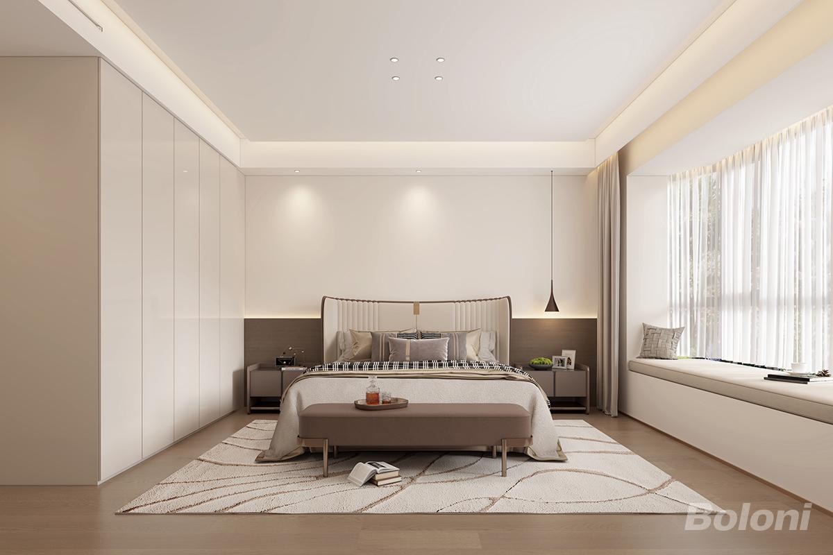 卧室以米白与木色为主调,大窗引入自然光线,简约家具与柔和灯光营造舒适氛围,整体布局温馨雅致,让人在忙碌一天后得到充分的放松与休息。