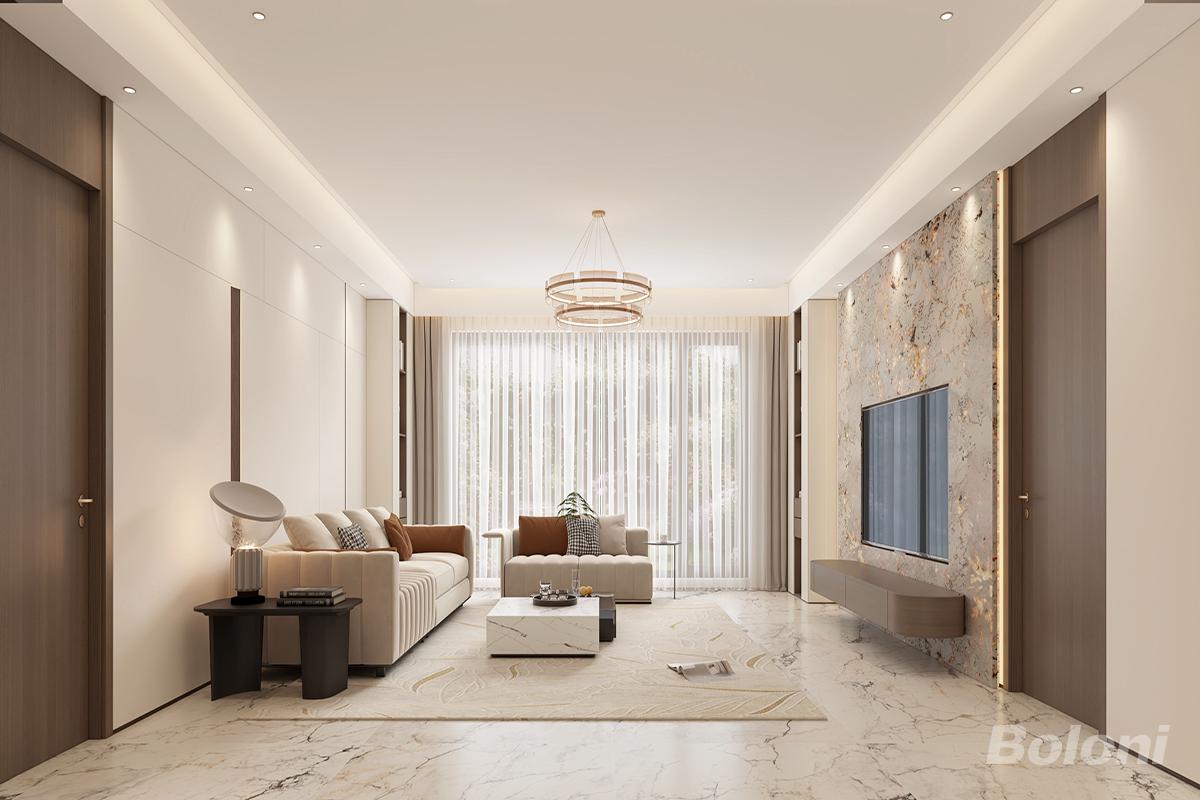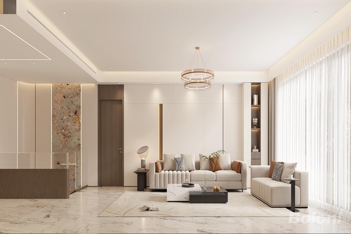 客厅以米白与木色为主调,线条简洁利落,大理石地面与精致吊灯提升空间质感,沙发与茶几搭配舒适实用,整体设计明亮通透,展现现代生活的优雅与从容。