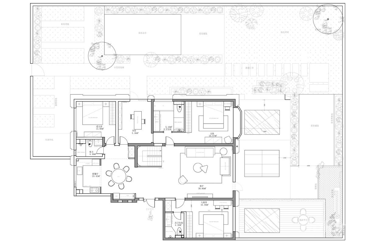 该层布局合理,功能分区明确,包含客厅、厨房餐厅、卧室、卫生间及书房等区域,动线流畅,采光充足,客厅的大落地窗效果让室内与庭园更好的融合,适合家庭生活与日常起居。