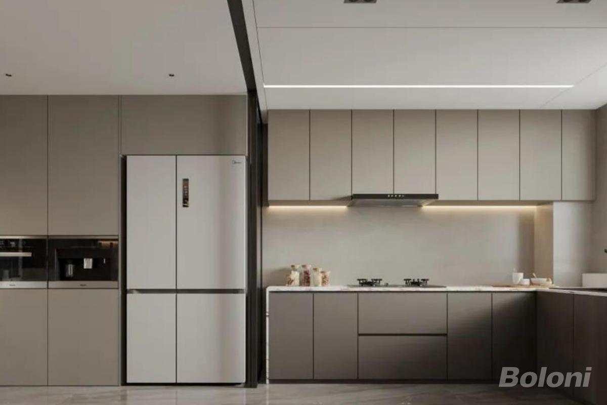 厨房以现代轻奢“减法美学”构建,低饱和灰调橱柜衔接哑光岩板,暗藏线性灯晕染层次。金属嵌条隐为细节伏笔,冰箱与柜体一体化消弭边界,极简轮廓里,材质肌理的细腻碰撞,让烟火日常浸润克制的精致 。