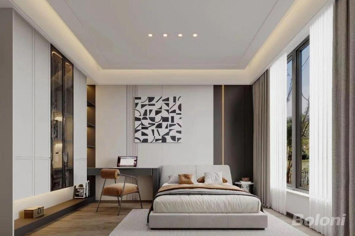 主卧以现代轻奢的“减法叙事”营造松弛感:低饱和米灰墙地构建宁静基底,皮革床具、哑光木柜借利落线条诠释极简秩序。线性灯带藏于柜体,格纹毯与金属小物作点睛之笔,让材质肌理与光影层次,共同织就沉浸式休憩氛围 。