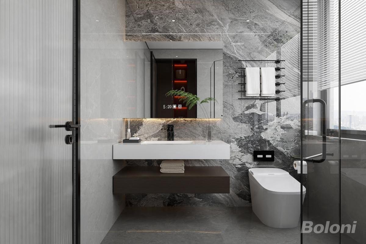 卫生间以灰调大理石摹写自然肌理,构建轻奢基底。悬浮台盆衔接深色木作,金属件与智能镜点亮细节,线性光柔化边界。玻璃隔断通透延展,在功能布局中,以材质碰撞与光影层次,诠释“简而显贵”的现代轻奢卫浴哲学 。