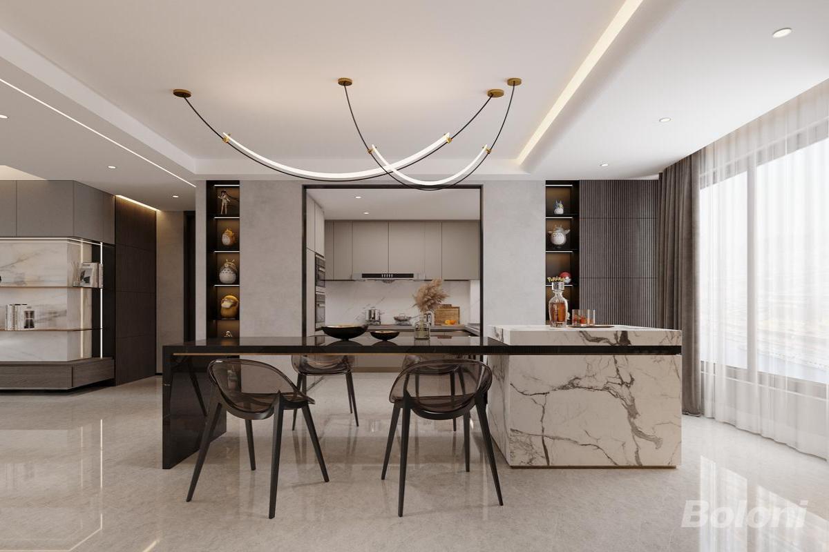 本餐厨空间为现代轻奢风格,以大理石岩板与金属线条营造奢华质感,灰调主色搭配黑金点缀。艺术感吊灯、透明餐椅提升设计感,嵌入式展示柜陈列艺术摆件,兼具功能性与美学,尽显精致雅致的轻奢生活格调。
