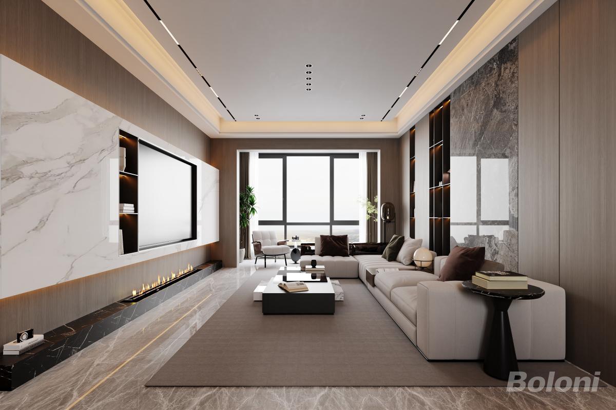 本客厅为现代轻奢风格,以木饰面板与大理石岩板打造电视背景墙,搭配线性电子壁炉,质感高级。暖灰与米白主色调,辅以深棕点缀,多层次灯光营造精致氛围,软装如金属质感家具、艺术摆件,尽显低调奢华与舒适雅致。