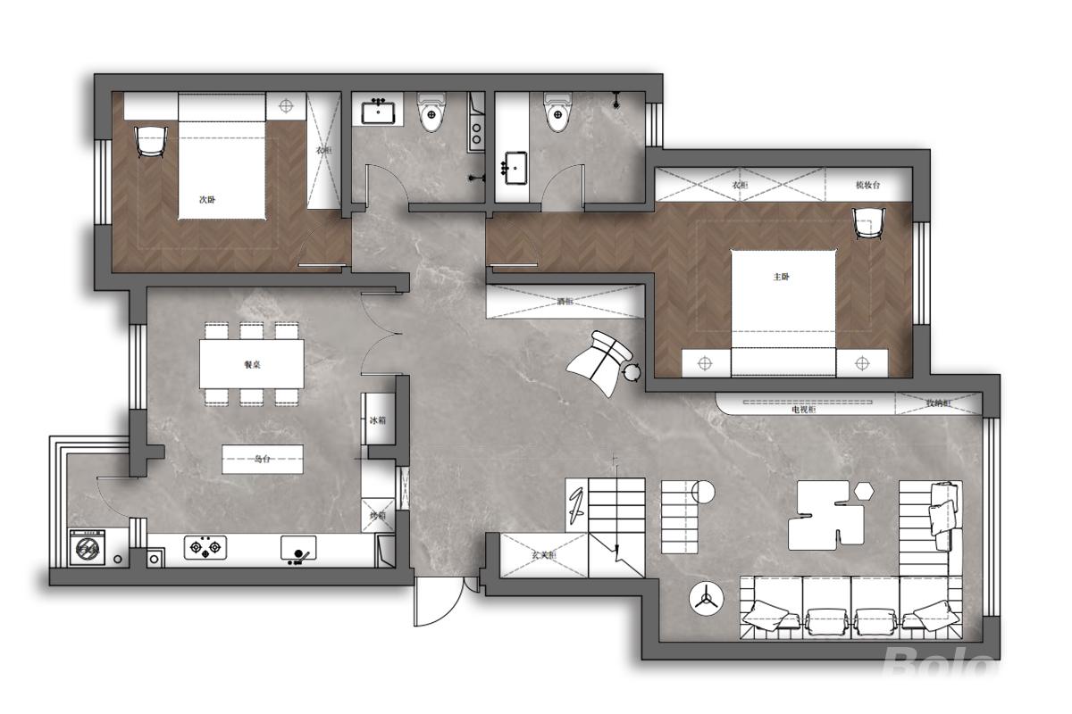 本设计以现代轻奢风格为核心,通过材质的精致搭配、色彩的高级调和与细节的艺术化处理,打造出兼具奢华质感与舒适体验的空间,诠释出当代都市精英对品质生活的追求。