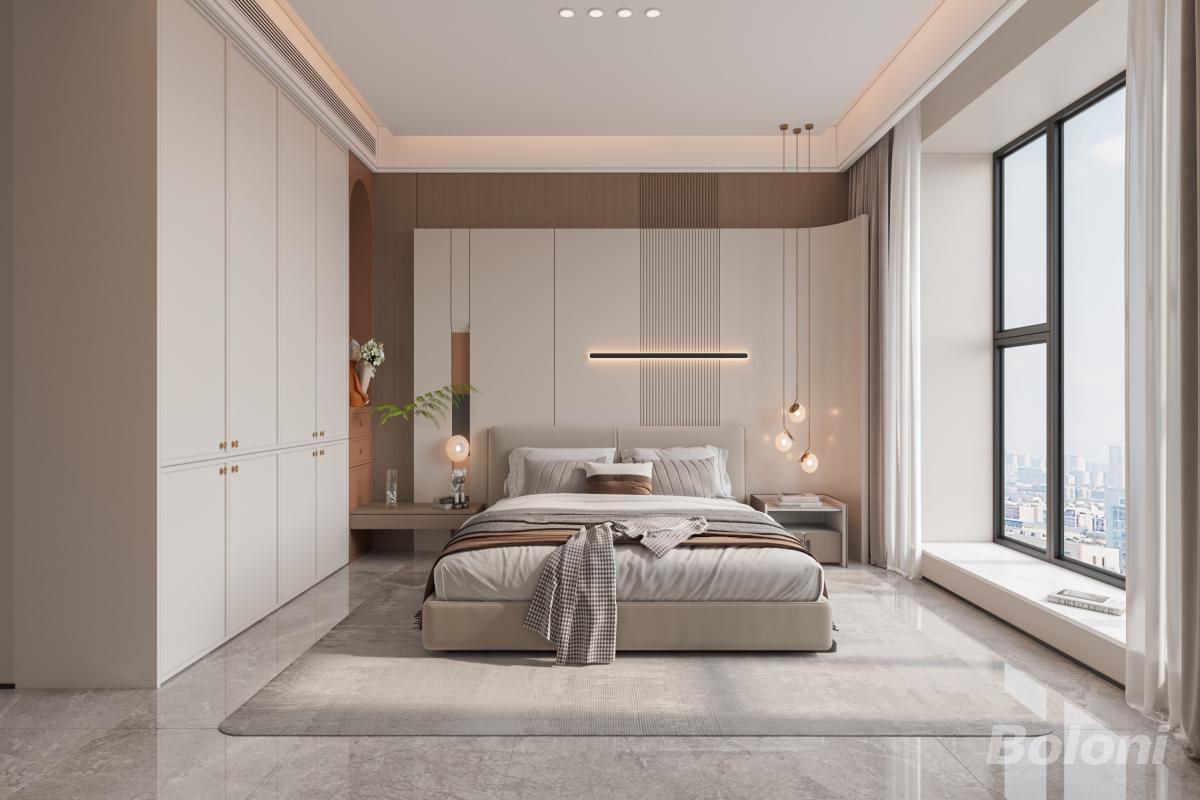 本轻奢风卧室以暖棕、米白为基调,融合精致柜体与大理石地面,尽显质感。床头线性灯、球形吊灯营造层次光影,简约床具搭配轻奢软装,大窗引入城市景观,于舒适中诠释 “精致不张扬” 的轻奢起居格调。