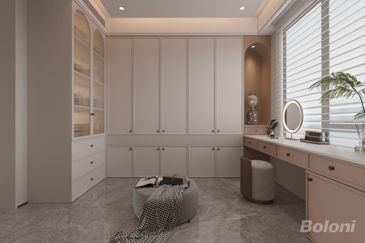 本轻奢风空间以柔粉色系为底,融合精致柜体与大理石地面,尽显优雅质感。玻璃展示柜、弧形妆台搭配金属圆镜,细节处彰显轻奢格调,百叶窗引入柔和光线,于收纳与美妆功能中,诠释 “精致且雅致” 的轻奢生活美学。