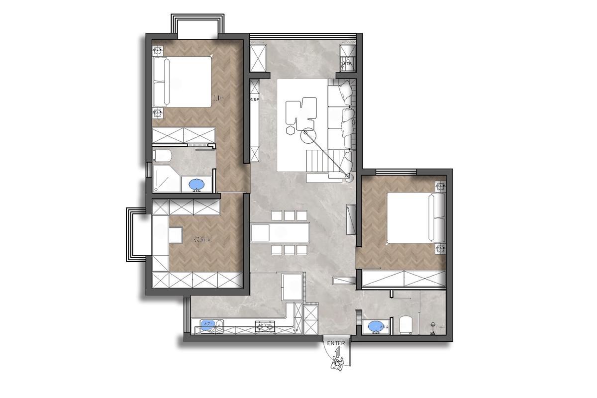 本轻奢风户型设计,以通透布局整合空间,卧室人字拼木地彰显质感,公共区域大理石铺就高级感。功能分区清晰,动线流畅,通过材质对比与简约线条,在空间规划中诠释 “奢于质,简于形” 的轻奢居住美学。