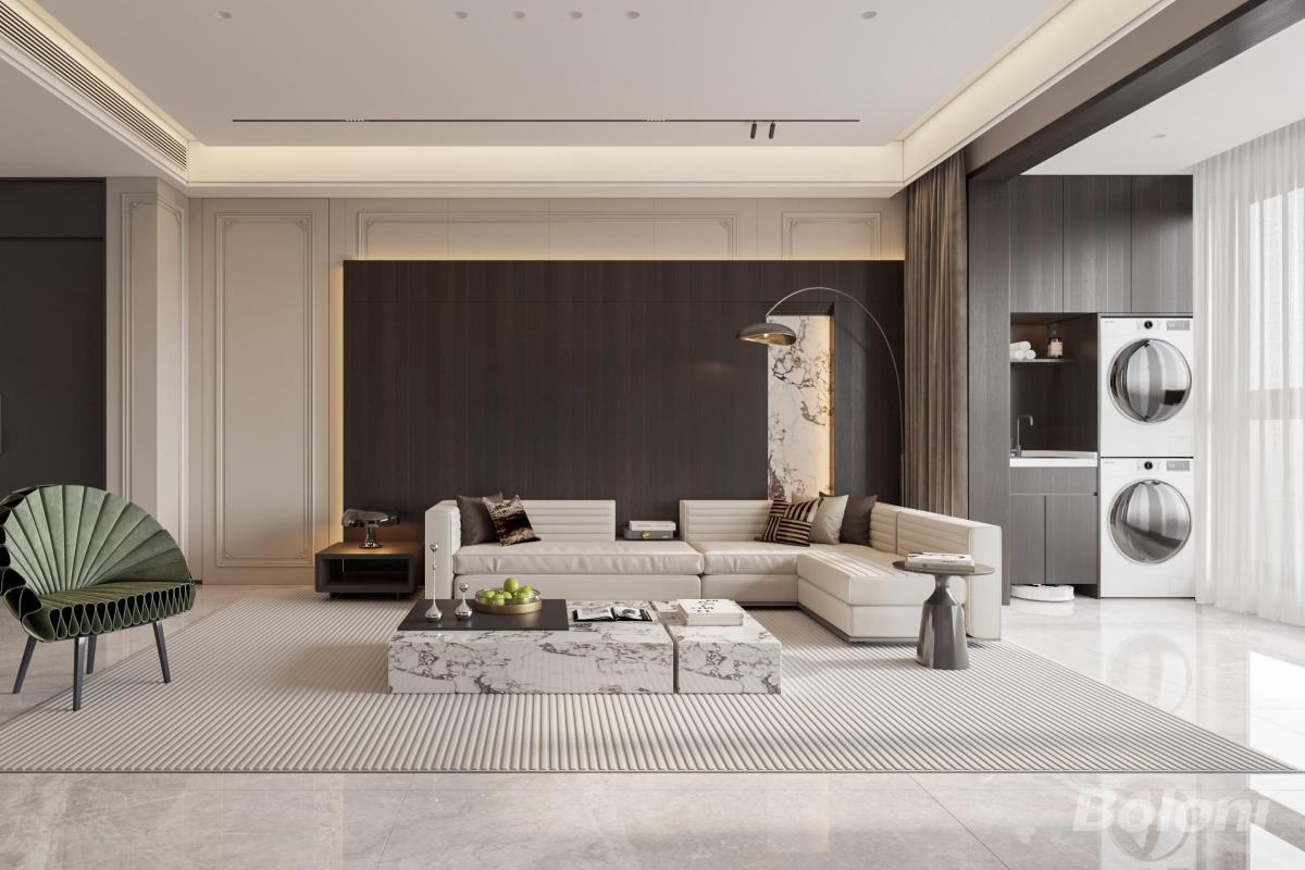 本轻奢风客厅以中性色为底,融合大理石的华贵、木质的细腻与真皮的精致。大理石茶几、艺术单椅与弧形落地灯彰显质感,暗藏灯带提升氛围,在简约布局中尽显奢华品味,诠释 “精致不繁杂” 的轻奢生活格调。