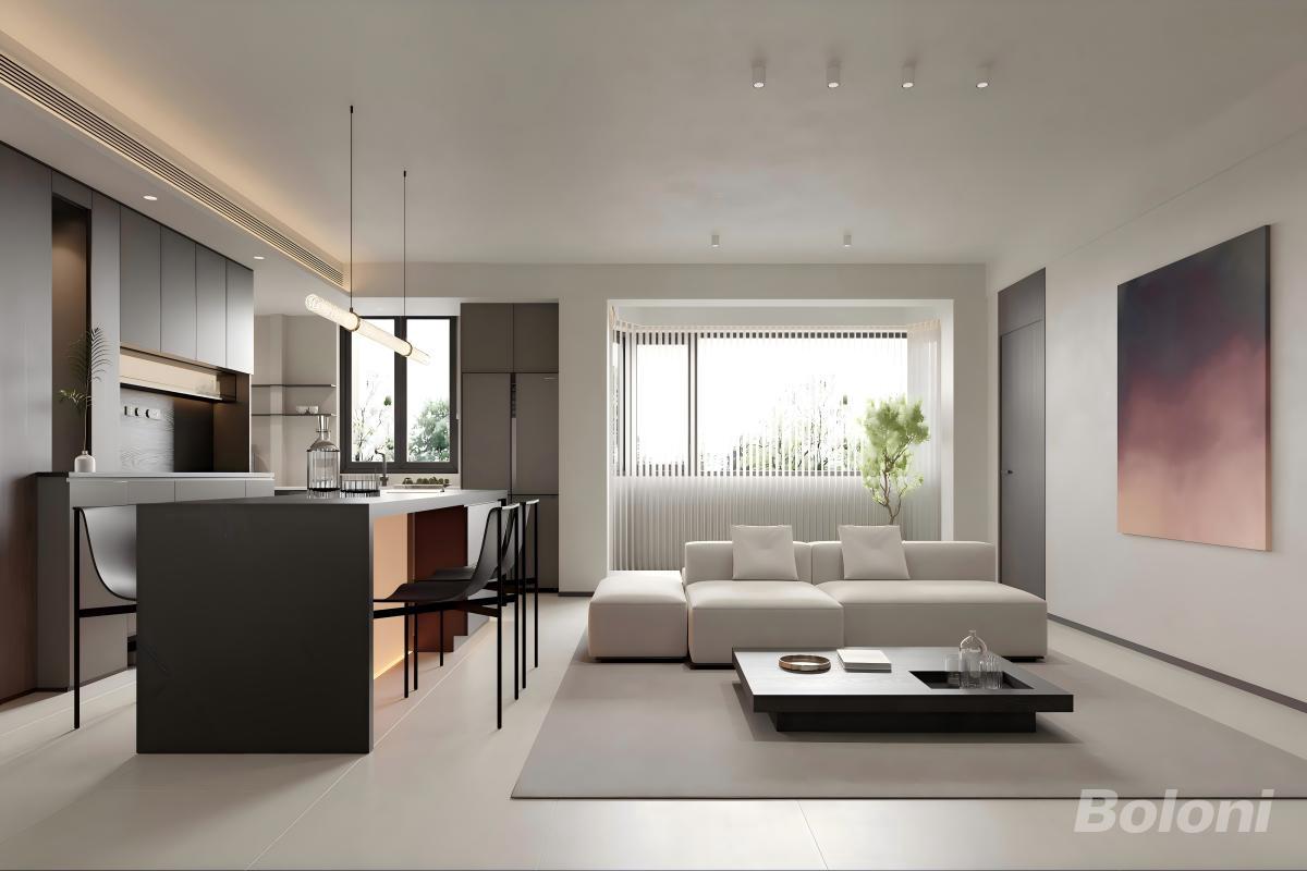 以黑白灰 + 浅米白的中性色系为主,通过深灰岛台、浅灰橱柜、米白沙发的层次组合,营造出简洁克制的视觉效果;墙面大幅艺术画的低饱和渐变色彩,为空间注入细微的艺术感,却不破坏整体的极简基调。